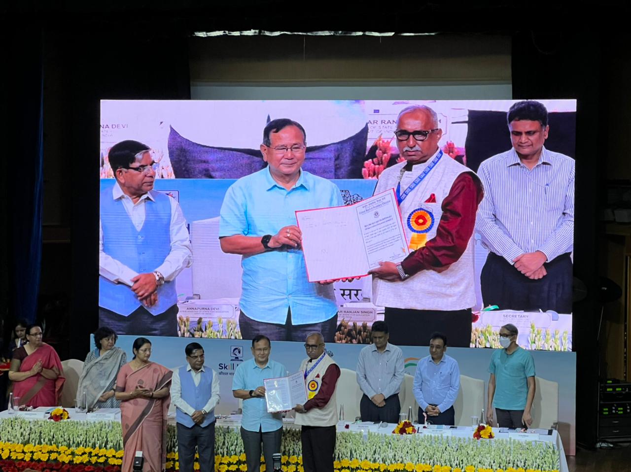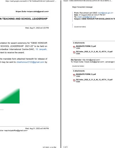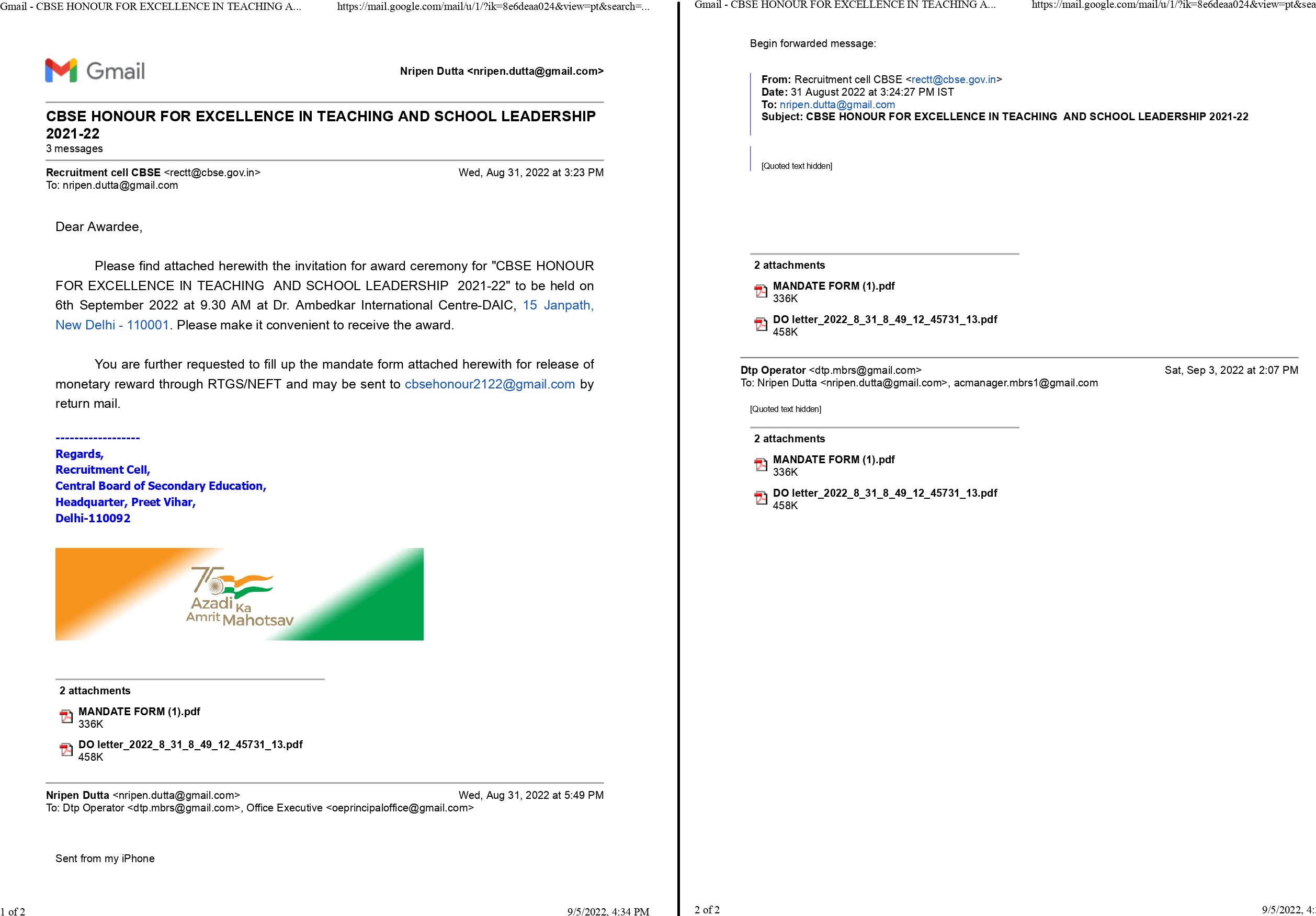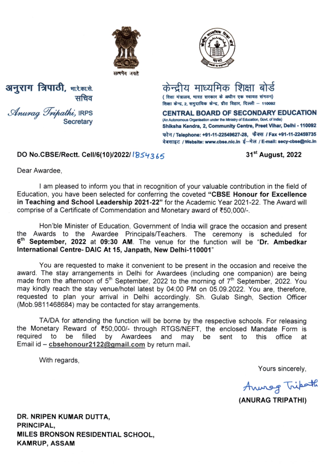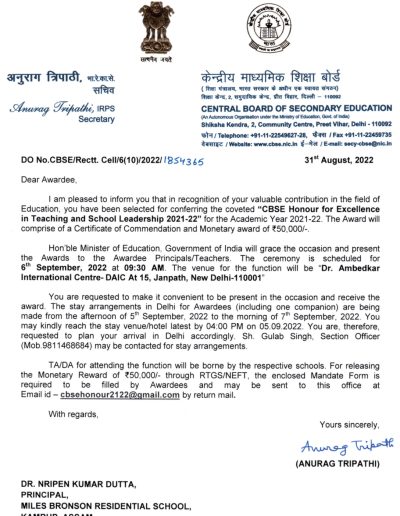Dr. Nripen Kumar Dutta, Founder & Principal, Miles Bronson Residential School, Borjhar, Guwahati conferred with the CBSE National Award for Excellence 2022 in Teaching & Leadership by the Union Ministry of Education (MoE), Govt. of India in collaboration with the Central Board of Secondary Education (CBSE), New Delhi. The award was presented by Dr. Rajkumar Ranjan Singh, Honourable Minister of State Govt. of India in presence of Smt. Annapurna Devi and Dr. Subhas Sarkar, both Ministers of Education (State) at an award ceremony held on 6th September 2022 at Ambedkar International centre, New Delhi organized jointly by Ministry of Education (MoE), New Delhi, Govt. of India and CBSE. Along with the Award Dr. Dutta received a merit certificate and cash prize of Rs.50,000/-.